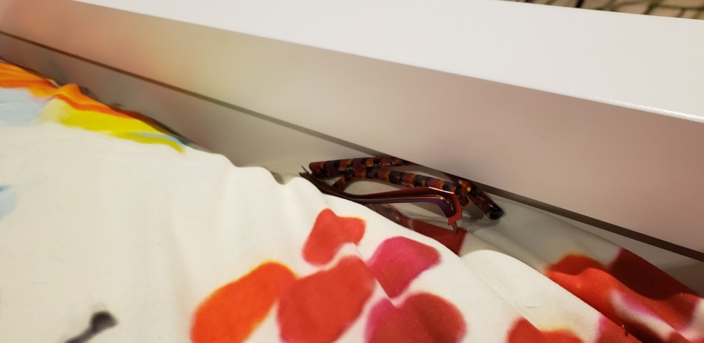 I reached over to the nightstand for my glasses … and they weren’t there. Odd. Somewhere in the night, I remembered sweeping the comforter over my snoozing body, and there was a faint recollection of nudging something.