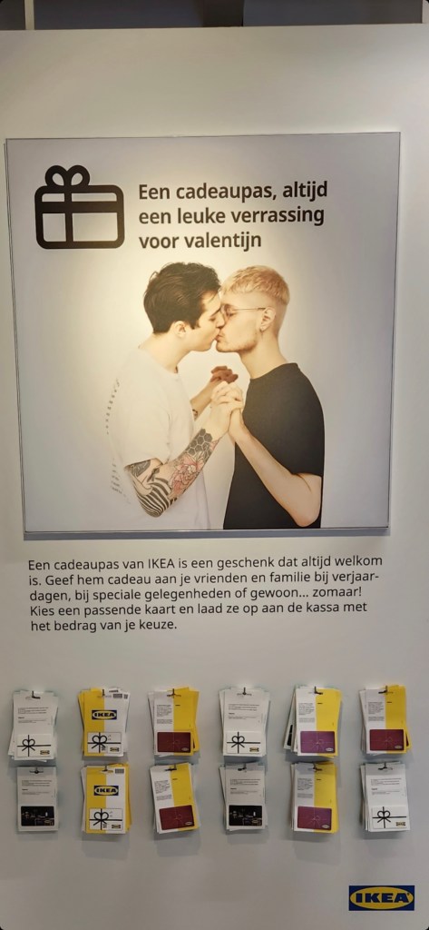 With such songs in my head, I was roaming through the aisles one day. I turned a corner and there hung the poster you see before you. I was stopped. I was stunned. Two men kissing. I thought “How lovely” and then “How unique”. A money-making corporation presenting its values for all to see. Maybe North American stores have the same photo displayed but I don’t remember seeing it. Plus I don’t live there anymore.
