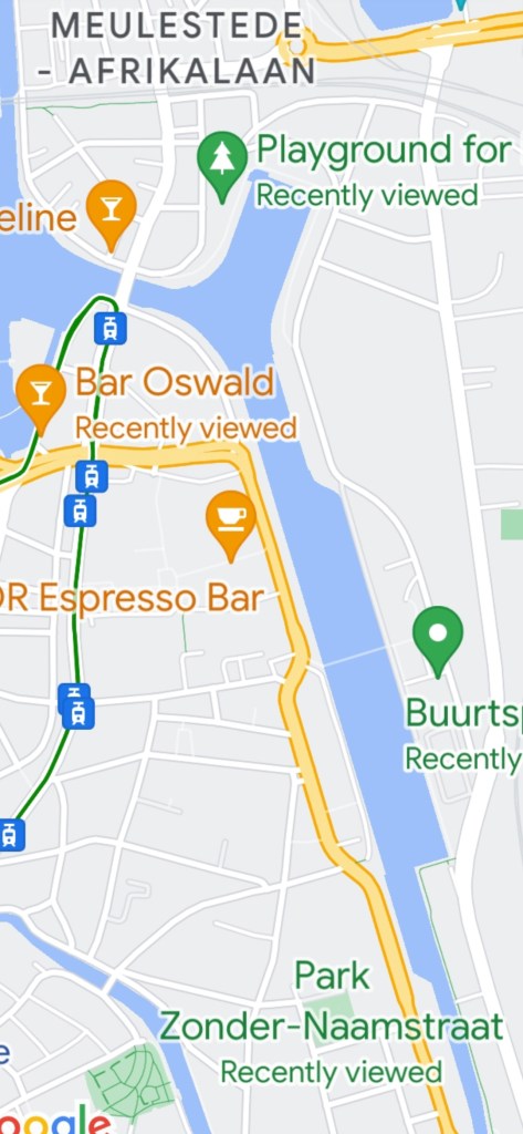 I went for a long walk in the rain, exploring unknown parts of Ghent. Here’s a map, something that I refused to use on the journey: