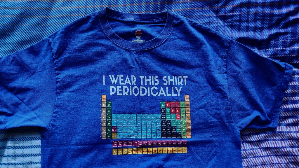 Sadly, I know virtually nothing about elements. Wearing the shirt, however, gives me an aura of knowledge. Perhaps I’m seen as a master of the Scientific Method and the one who will discover the cure for cancer. And perhaps not.