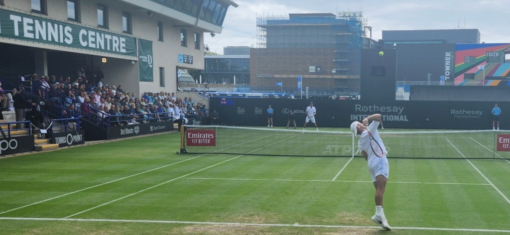 Because of the rain yesterday, a men’s semi-final was postponed to this morning – on a court that was first come first served for us spectators. I arranged to be first come … and first row. Here’s a photo of Tommy Paul serving to Grégoire Barrère: