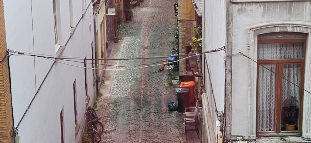 We said goodbye. Only back in the apartment did I think of John’s song. I went to my guest bedroom window and took a picture of Lieven, still sitting there.