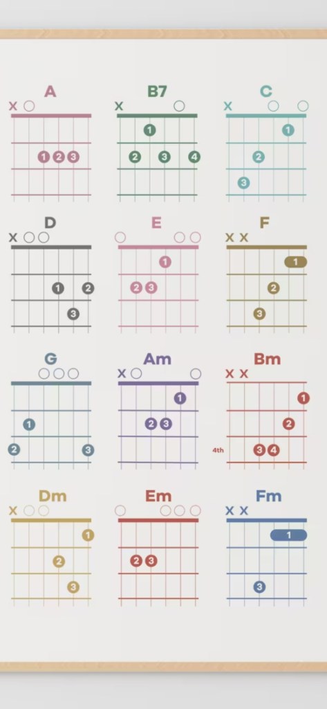 Way back then, and later today, I played only in the key of C – three major (or happy) chords (C, F and G) and three minor (or sad) ones (D, E and A). You can make a lot of cool music with those six! Here’s what they look like on the fingerboard, along with six cousins: