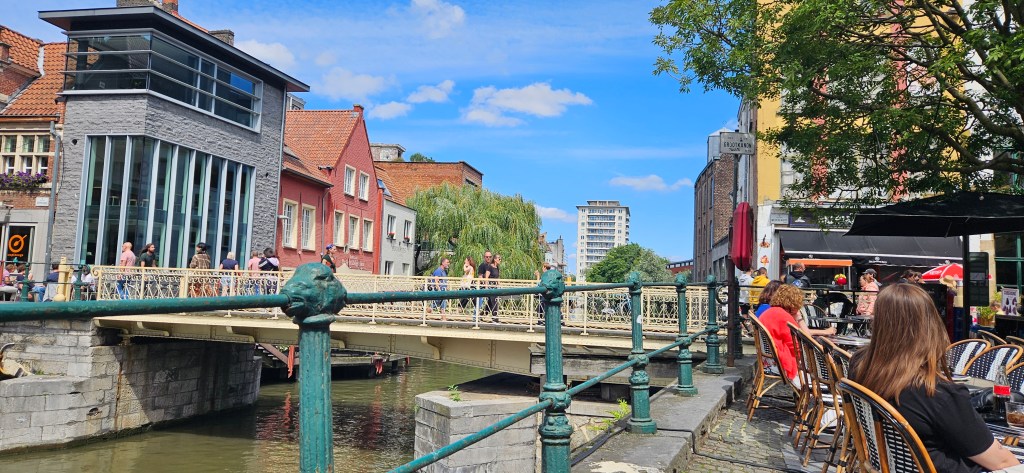 Here I am sitting on the terrace of T’Kanon café by the Leie River yesterday. For two hours. A small part of me says that’s too long, that I should be out and about doing useful things. But I don’t want to be useful. I want to watch the world flow by and talk to lovely people.