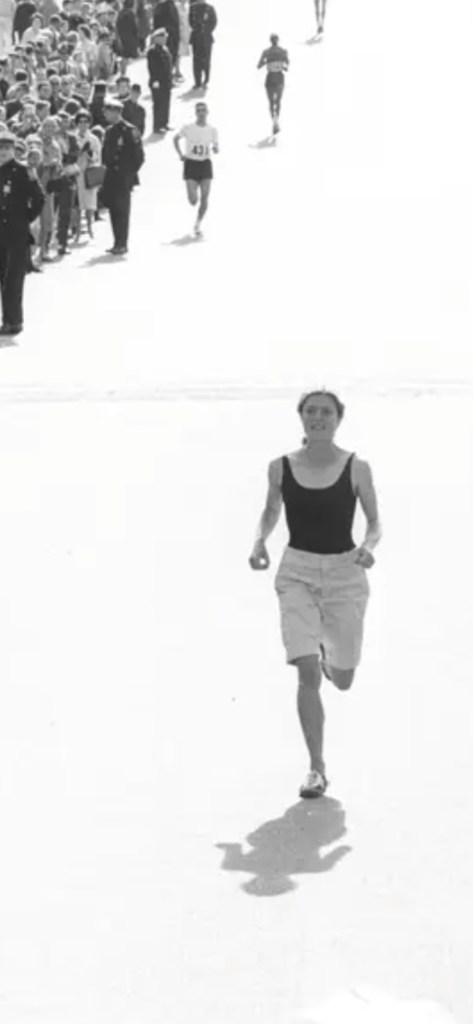 “Before 1966, the longest Amateur Athletic Union-sanctioned race for women was one-and-a-half miles.” In April of that year, Bobbi Gibb blew that idea to smithereens. She ran the Boston Marathon (26.2 miles) … and completed it. This despite the prevailing wisdom that “women are not physiologically able to run a marathon”.