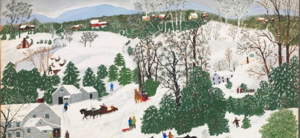 Grandma was famous for her landscapes of American rural life. Here’s one called Out For Christmas Trees: