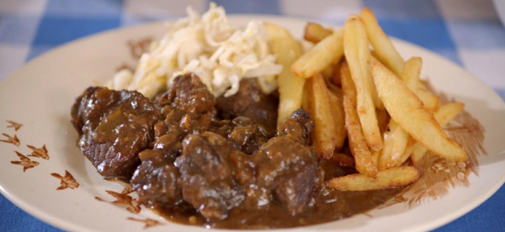 Geert, a fellow customer, is next. “Stoofvlees”. Translation: Flemish beef stew, a classic Belgian dish. A yummy choice.