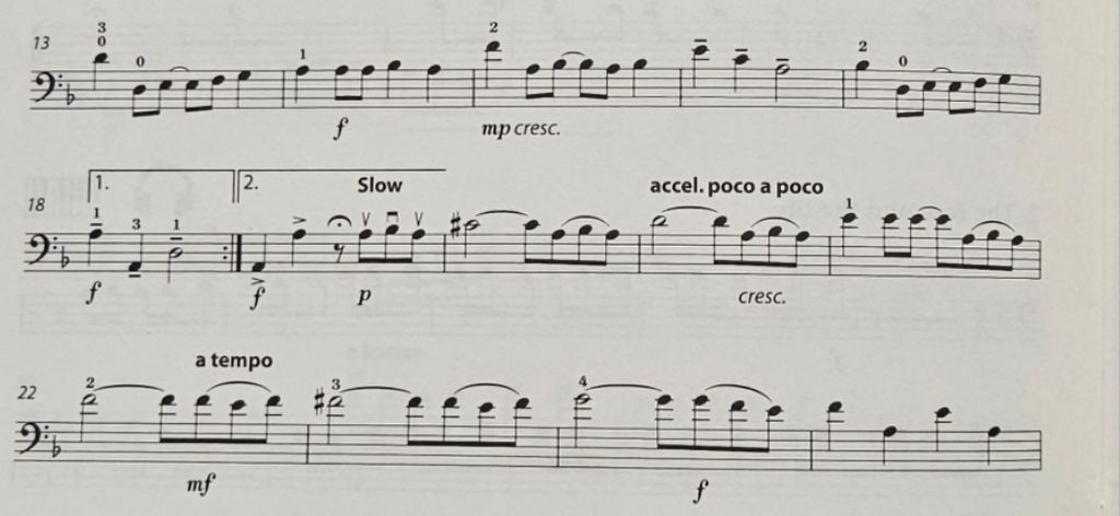 And the notes are often not written on the beat. The curved lines you see in the sheet music mean that the notes below them need to be played smoothly, with one long bow stroke. Ha! I’m not there yet.