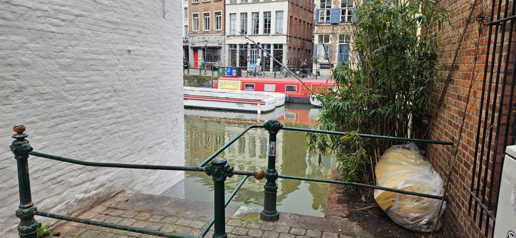 I like wandering its few metres to the edge of the Leie River. Here’s a delightful out-of-the-way spot. Squeeze under the railing and you’ll find steps for sitting and wondering.