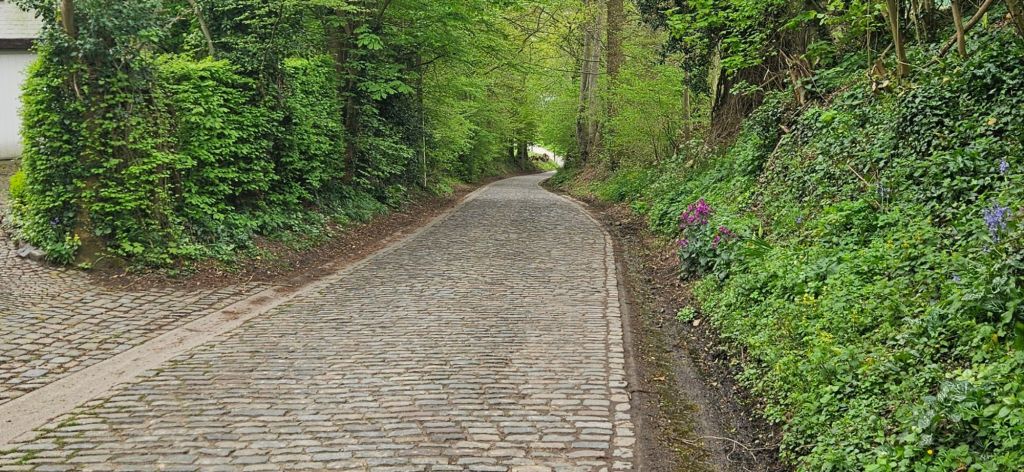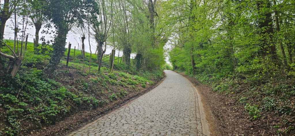 “Right here [a Y-shaped intersection], turn left. On the right is the Taaienberg. It’s all cobbles.”