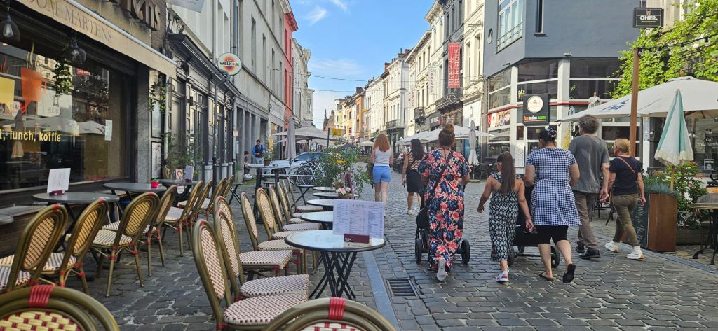 Most of the chairs face across the cobblestones to the other side. My body tells me not to sit there. My chair faces the curving of the Oudburg – the morning sun on the old buildings, families slowly disappearing on the horizon. Or coming ever closer.