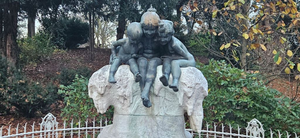 Deeper into the park, I came upon this statue and pool. Three kids hugging each other, and looking down at … what?