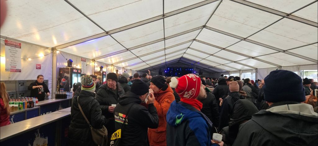 Here’s the civilized part of the proceedings: fans out of the rain, well lubricated with good Belgian beer, eardrums throbbing with the music coming from the vicinity of those blue lights at the far end.