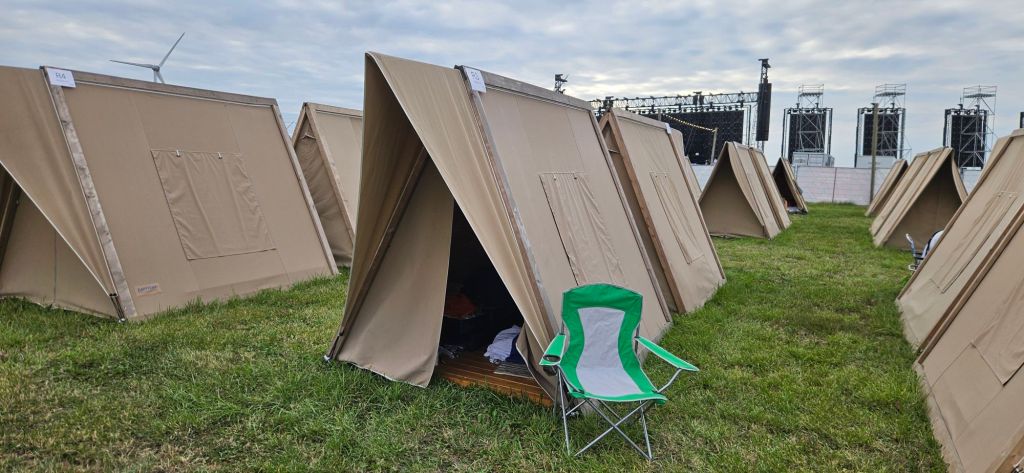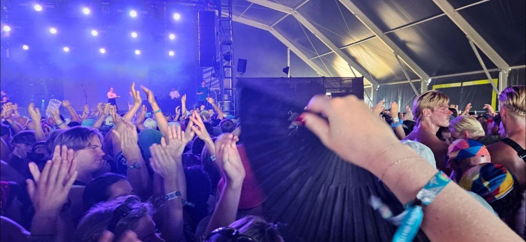 Yesterday afternoon I was sitting in the shade at a picnic table when I noticed hundreds of people walking or jogging across the green towards one of the Dour stages – Le Labo. Soon they were rockin’ to Roland Cristal, throwing their arms in the air in a packed room under a blessed roof.