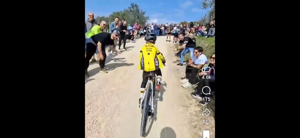 I have a reel to show you. Tiny boy, giant bike, steep hill: all the ingredients for amazement. And the road is lined with the young and the old and the in between, doing what human beings should do naturally … connecting.