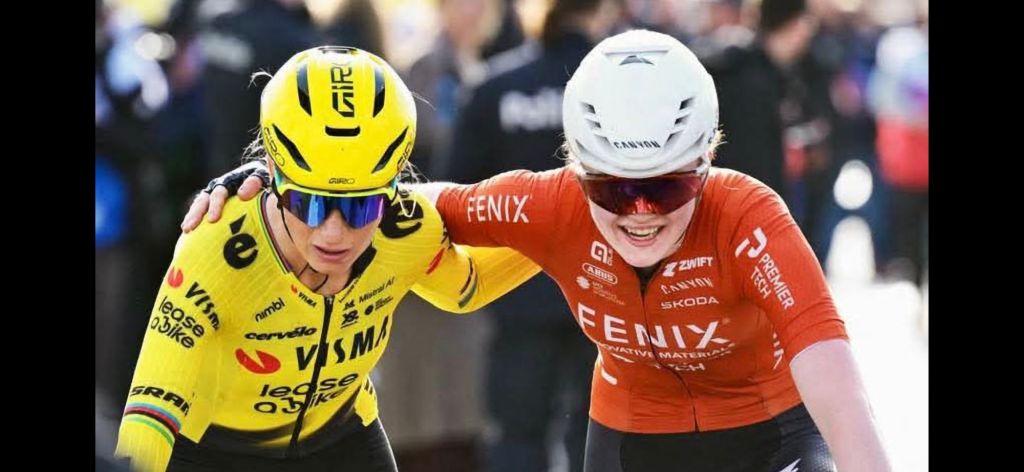 On the right is my favourite cyclist – Puck Pieterse from The Netherlands. She’s hugging Pauline Ferrand-Prevot from France. They just finished sprinting for second place in the Ronde van Vlaanderen. Pauline won the battle. For me, the picture says what competition should be.