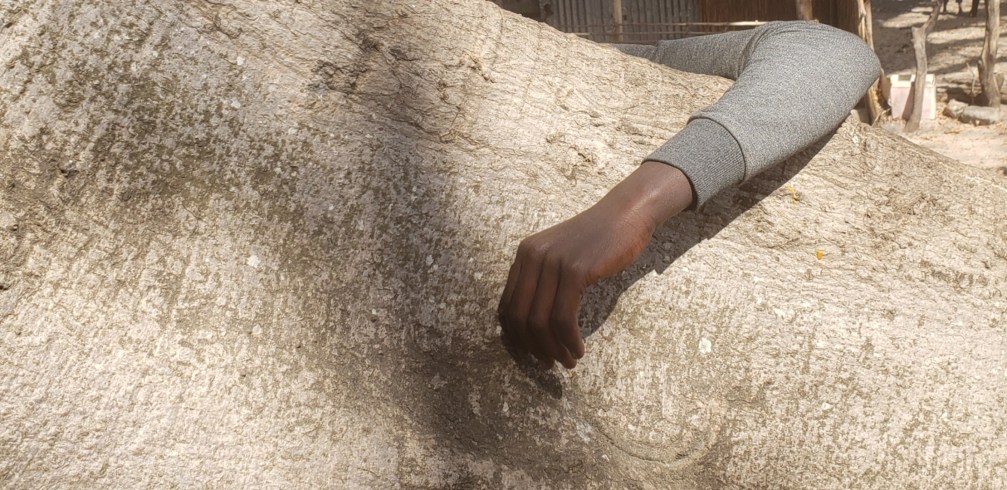 We returned soon to the other side of the tree, where apparently there were no bees, since we were invited to come close. The tree is a fromager, so named because its soft wood made perfect boxes for the transport of cheese. Facing me was the largest fromager in West Africa, approximately 1000 years old. Its bark folded in marvelous ways. One exposed root many metres from the trunk was named Croco by the residents, due to it resembling a crocodile.